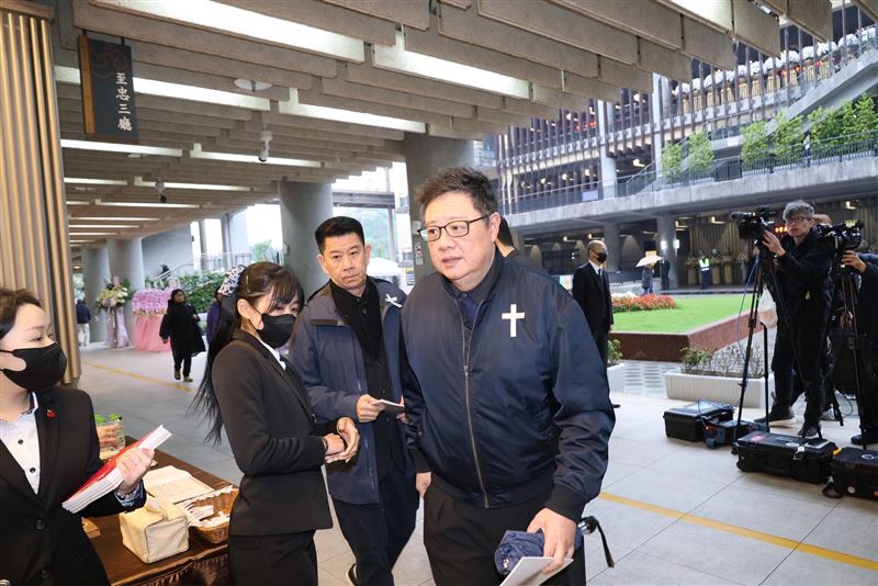 陶晶瑩跟李李仁到場。(圖/記者鄭孟晃攝影)袁惟仁(小胖老師)今年2月2日病逝,告別式於今天在台北市博愛館舉行,現場遺照也曝光,照片中的小胖老師手彈吉他,靈堂布置以白色花海為基調,溫馨莊嚴。而殯葬彌撒儀式正在進行,陶晶瑩跟李李仁夫婦也一身黑衣到場。